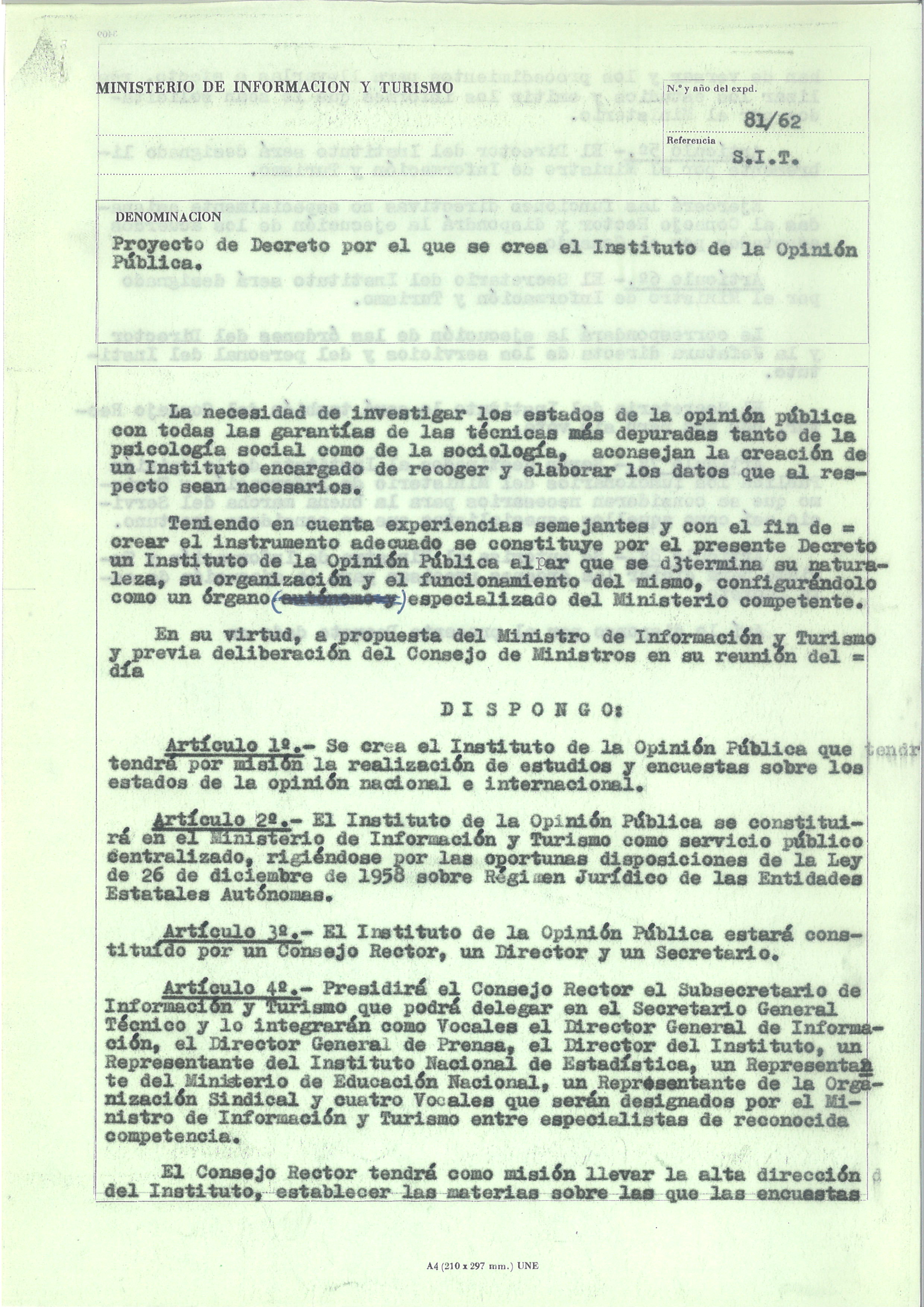 El IOP se crea el 11 de enero de 1963 como un organismo adscrito al Ministerio de Información y Turismo (Enlace al BOE de creación ); aunque en un primer momento se pensó que tuviera la consideración de organismo autónomo. La condición de “autónomo” fue descartada en el proyecto de ley que fue remitido al Consejo de Ministros en diciembre de 1962 (pincha aquí para acceder a la imagen cedida por el Archivo General de la Administración).