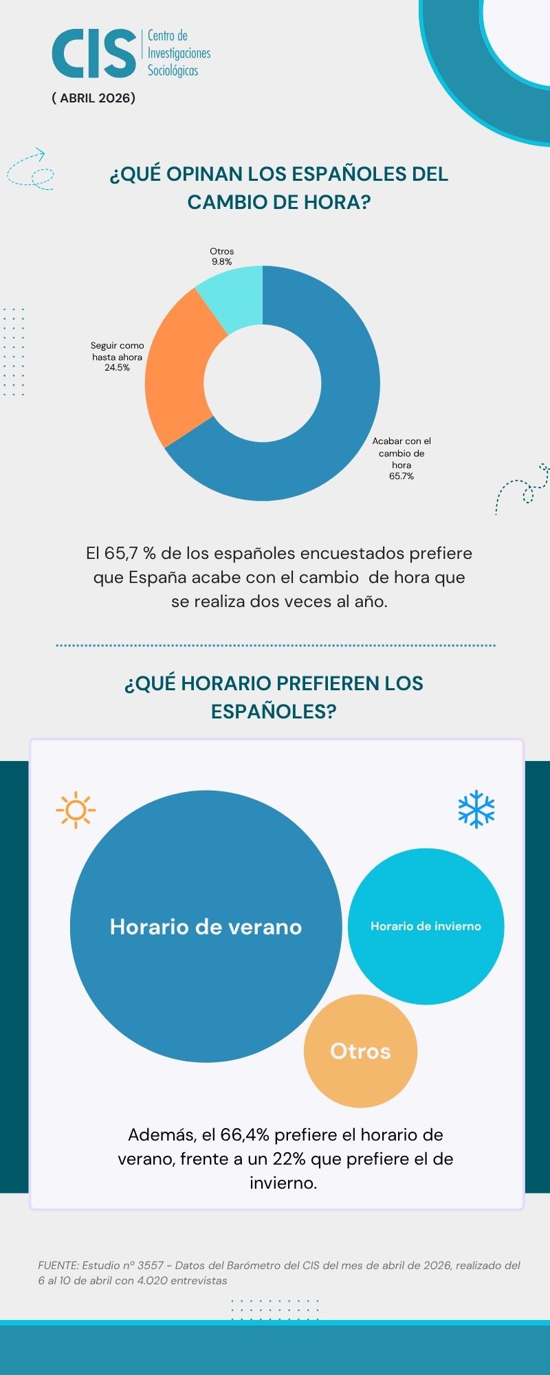 En cuanto a la elección horaria, el 66,4% se inclina por el horario de verano, frente a un 22% que prefiere el de invierno.