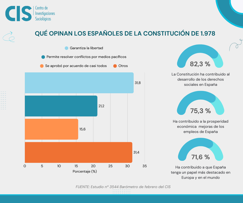 The most significant aspects of the current Constitution for Spaniards are positive. First, 31.8% say it "guarantees freedom," 21.2% believe it "allows for the peaceful resolution of conflicts," and 15.6% say it "was approved by almost everyone's agreement."