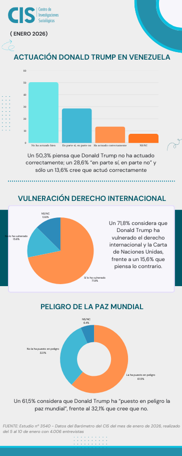Tras la intervención militar de EE. UU. en Venezuela, el Barómetro de enero de Centro de Investigaciones Sociológicas (CIS) ha incluido preguntas para conocer el estado de ánimo y la percepción de los entrevistados acerca de estos acontecimientos.  Se concluye que el 50,3% de los consultados piensa que Donald Trump “no ha actuado correctamente”, un 28,6% cree que “en parte sí y en parte no” y solo un 13,6% afirma que “ha actuado correctamente”.