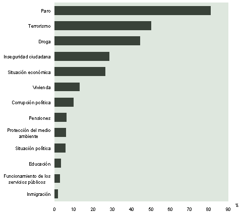 Para finalizar, otra aproximación al mundo del trabajo. A los españoles les preocupa el paro y el terrorismo. Reconocen como causas primeras de la escasez de empleos, la falta de inversión por parte de los empresarios y las nuevas tecnologías que eliminan mano de obra. Pensando en el trabajo, la mayoría (72%) cree que es sólo un medio de ganarse la vida y el 66% considera que aunque hay que trabajar lo mejor posible no debe interferir en los otros aspectos de la vida. A la hora de valorar un empleo lo más importante es que sea seguro y estable. Los que trabajan consideran su trabajo actual interesante, seguro, acorde con su formación y que les permite ayudar a otras personas y desarrollarlo de forma independiente.