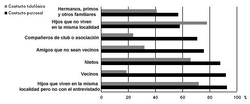 • Nota: las barras representan el porcentaje de entrevistados que declaran tener contacto con cada uno de los grupos de personas al menos varias veces al mes. Se han excluido del cálculo los casos en que no procede.