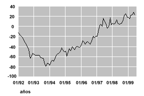 Diferencia entre los que piensan que la situación económica es "muy buena" o "buena" y los que piensan que es "mala" o "muy mala".