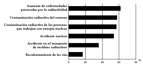 Dedicamos el siguiente epígrafe a la valoración de los riesgos y las medidas de seguridad inherentes a la utilización de la energía nuclear. Contaminación, almacenamiento de residuos y accidentes nucleares son los riesgos más citados por los españoles. En cuanto a las medidas de seguridad, un 55% de los españoles considera que la tecnología actual no ofrece soluciones seguras y que las medidas de seguridad existentes respecto del almacenamiento y transporte de residuos radiactivos son insuficientes (56%).