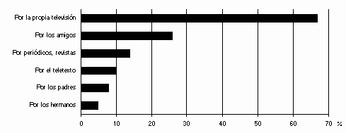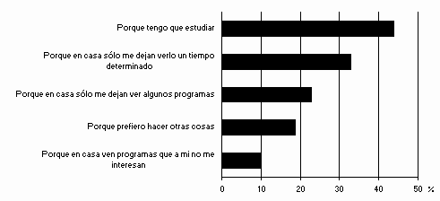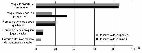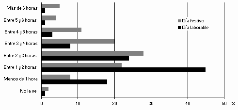 Con más detalle, presentamos una selección de datos acerca del uso que la población infantil (niños y niñas con edades comprendidas entre 7 y 16 años) hace del medio televisivo. Ver la televisión no es la actividad a la que los niños dedican más tiempo cuando no están realizando actividades escolares; sin embargo, la mayoría de ellos (80%) dedica su atención a este aparato más de una hora al día, porque les divierte y entretiene.