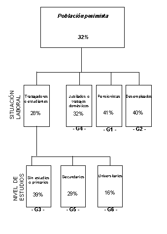 • Para determinar quienes tienen más probabilidades de estar de acuerdo con la proposición “soy muy pesimista ante el futuro” se ha utilizado un análisis de segmentación. Este análisis distingue, por un lado, la variable que se desea explicar (grado de pesimismo) y, por otro, las variables que mejor predicen (predictores), que tienen por finalidad formar grupos que sean muy diferentes entre sí.