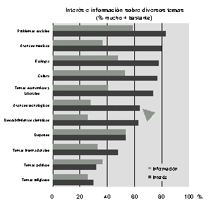 Continúa este Boletín con datos sobre Ciencia y Tecnología, se observa un alto interés por el tema (64% declara estar muy o bastante interesado) siendo la principal fuente de información los documentales que se presentan en la televisión. En general, se aprecia una gran confianza de la sociedad española ante el avance tecnológico ya que permite que la vida sea más saludable, fácil y cómoda (69%), frente al 21% que afirma que los conocimientos científicos no se necesitan para nada en nuestra vida diaria.