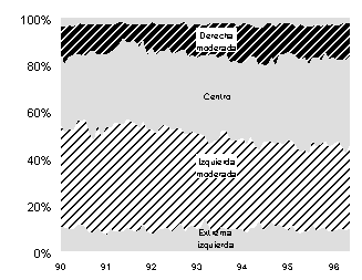 • Autoubicación de los entrevistados en una escala de 1 a 10 en la que 1-2 significa extrema izquierda; 3-4, izquierda moderada; 5-6, centro; 7-8, derecha moderada y 9-10, extrema derecha.