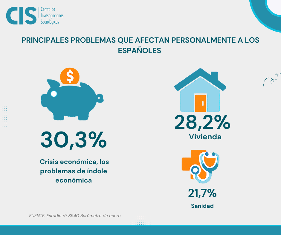 Si la jerarquía de preocupaciones se plantea en la esfera personal, “la crisis económica” aparece en primer lugar con un 30,3%, seguida de cerca por la vivienda, con el 28,2% de las respuestas, y la sanidad con el 21,7%.