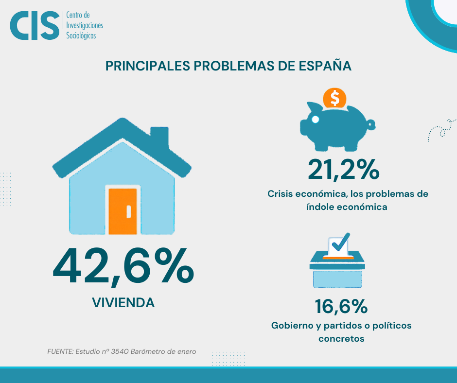 El acceso a la vivienda sigue preocupando al 42,6% de los españoles y es una cifra que va en aumento, con tres puntos más que el mes anterior, según ha podido constatar el Barómetro de enero 2026 del CIS. En segundo lugar, con un 21,2 % de las respuestas, se apuntan los problemas de índole económica y en tercero, con un 16,6%, se alude al Gobierno y a partidos o políticos concretos.