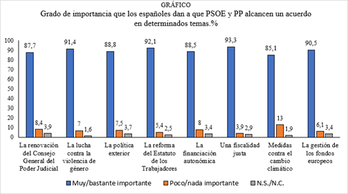 Al preguntar por algunos temas que se han convertido en noticia por la falta de pactos entre partidos, el 87,7% asegura que es “muy o bastante importante” que el el PSOE y el PP alcancen un acuerdo sobre la renovación del Consejo General del Poder Judicial. Un 91,4% opina lo mismo sobre la lucha contra la violencia de género y un 93,3% cree que es “muy o bastante importante” que se pongan de acuerdo sobre una fiscalidad justa.