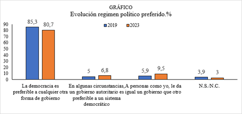 Para el 80,7% la democracia es preferible a cualquier otra forma de gobierno y un 6,8% afirma que en “en algunas circunstancias, un gobierno autoritario es preferible a un sistema democrático”. Hay que destacar también que a un 9,5% “les da igual un gobierno que otro”.