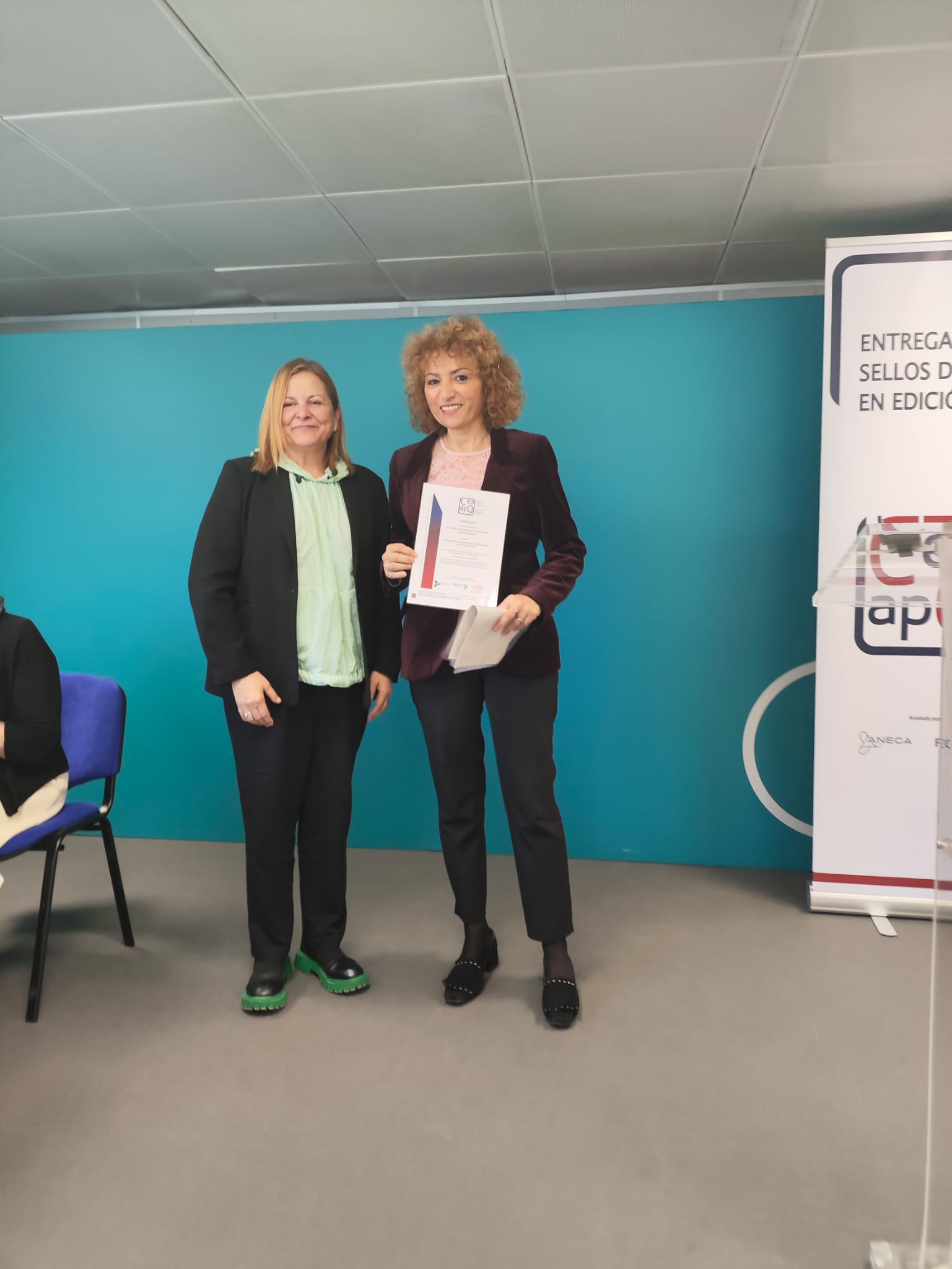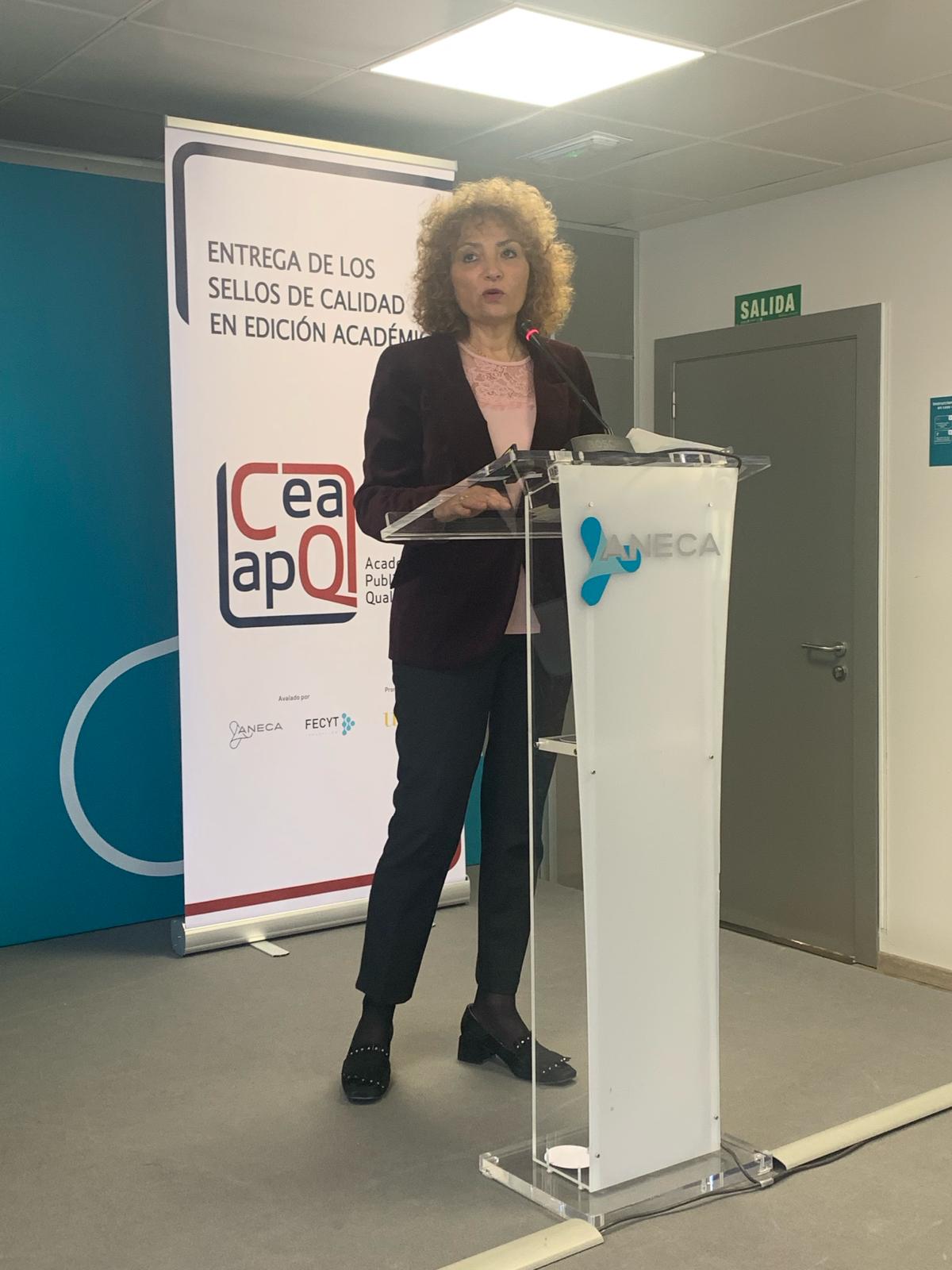 El 21 de marzo en la sede de la ANECA ha tenido lugar el acto de entrega durante el cual la directora del Departamento de Publicaciones y Fomento a la Investigación Mª Rosario H. Sánchez Morales recibió este galardón de la mano de Inma Aguilar, la directora general de la Fundación Española para la Ciencia y la Tecnología (FECYT).