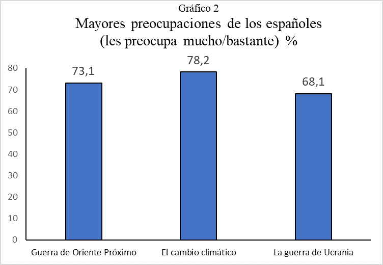 La invasión de Rusia a Ucrania es algo que preocupa “mucho o bastante” al 68,1% de los españoles, mientras que el conflicto en Oriente Próximo preocupa aún más, el 73,1% afirma que les preocupa “mucho o bastante”. Además, 44,4% de los españoles indica que “las prórrogas de alto el fuego temporal en Gaza para el intercambio de rehenes no van a mejorar las perspectivas de finalización del conflicto”.