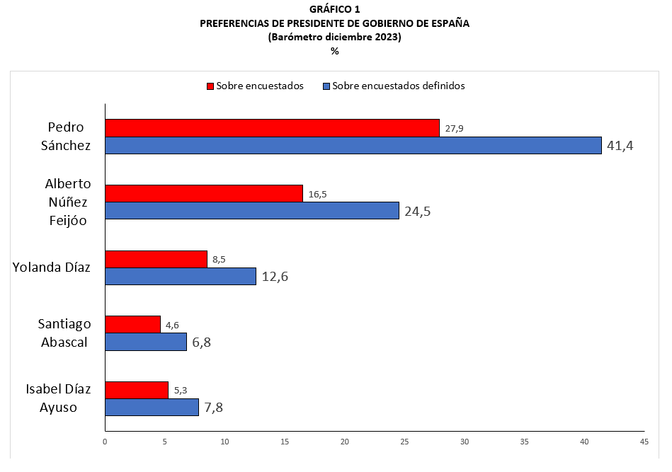 En cuanto a las preferencias a presidente del Gobierno, Pedro Sánchez sigue siendo el favorito para el 27,9% del total de encuestados, a 11,4 puntos de distancia se sitúa Alberto Núñez Feijóo con el 16,5%, Yolanda Díaz es la favorita para el 8,5%, e Isabel Díaz Ayuso se sitúa en cuarta posición con el 5,3% y por delante de Santiago Abascal (4,6%).