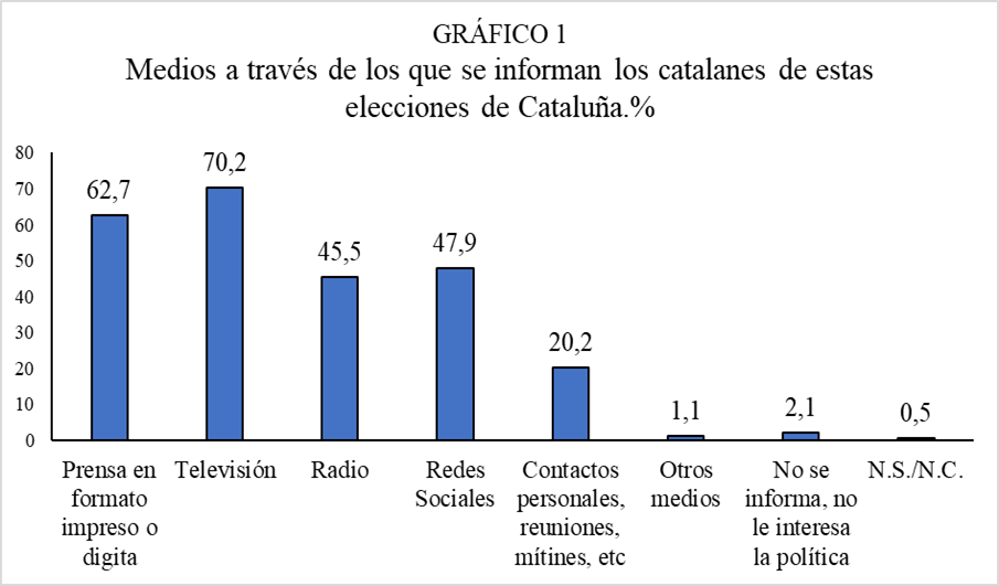 El 70,2% asegura que la televisión es el medio por el que más se han informado sobre programas y propuestas para estas elecciones, el 62,7% dice que la prensa -tanto en formato digital como impreso- es el medio que más han utilizado, y un 47,9% ha contestado que las redes sociales.