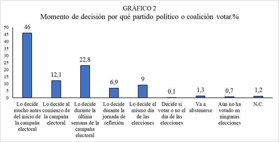 Un 46% afirma que decide su voto mucho antes del inicio de la campaña electoral, un 12,1% lo hace al comienzo de la campaña, un 22,8% durante la última semana de campaña, un 6,9% durante la jornada de reflexión y un 9% el mismo día de las elecciones. Además, un 1,3% ya tiene claro que se abstendrá.