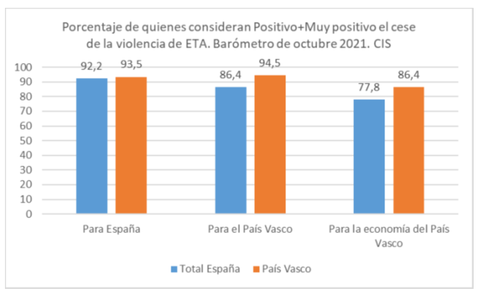 Madrid, 15 de octubre de 2021. Con motivo del décimo aniversario del anuncio del cese de la violencia de ETA, el CIS ha preguntado al respecto en el barómetro mensual de octubre. Este sondeo revela que el 92,2% de los españoles valora positivamente o muy positivamente el cese de la violencia de la banda terrorista, de ellos, un 59,1% de manera "muy positiva" y un 33,1% de forma "positiva". Mientras que solo un 3,7% cree que ha sido "muy negativo" o "negativo" para España. En el caso de la sociedad vasca, un 93,5% de vascos consideran "muy positivo" y "positivo" para España el fin de la violencia de ETA.