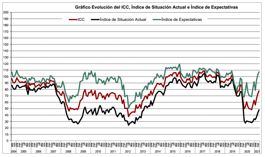 El ICC de abril (77,8 puntos) aporta el mejor dato desde abril de 2020, fecha en la que el índice si situaba en 49,9 puntos.