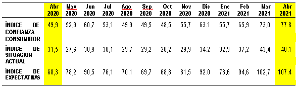 Madrid, 5 de mayo de 2021. La confianza del consumidor sube en el mes de abril según el informe mensual del Centro de Investigaciones Sociológicas. El ICC alcanza los 77,8 puntos, una mejora respecto a los 73,0 del mes de marzo. Tal incremento se debe al aumento de 4,7 puntos en la valoración de la situación actual, y a la subida de las expectativas, que se incrementa también en 4,7 puntos.