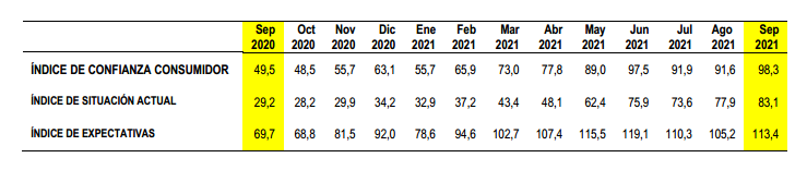 - El Índice de Confianza del Consumidor del mes de septiembre se sitúa en 98,3 puntos, 48,8 puntos más que en septiembre de 2020