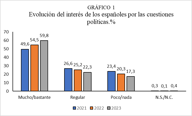 En términos generales, al 59,8% de las personas les interesa “mucho o bastante” las cuestiones políticas, frente a un 17,3% que ha contestado que les interesa “poco o nada”. Un 22,3% no sienten especial interés. Estos datos reflejan un incremento del interés por las cuestiones políticas en España de 10,2 puntos porcentuales desde el año 2021, cuando el porcentaje de los españoles que les interesaba la política “mucho o bastante” era del 49,6%.