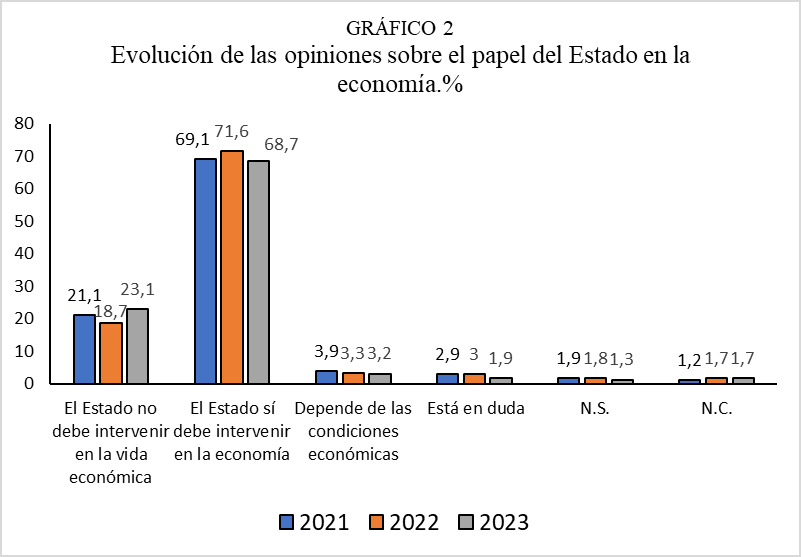 El 68,7% de los encuestados entiende que el Estado sí debe intervenir en la economía, mientras que un 23,15 responde que no. Un 3,2% afirma que depende de las condiciones económicas, y un 1,9% tiene dudas.