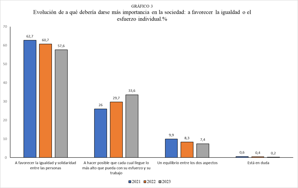 Por el contrario, va en aumento la evolución sobre el pensamiento del esfuerzo individual, que ha aumentado 7,3 puntos desde 2021, cuando eran un 26% los que se decantaban por esta opción.