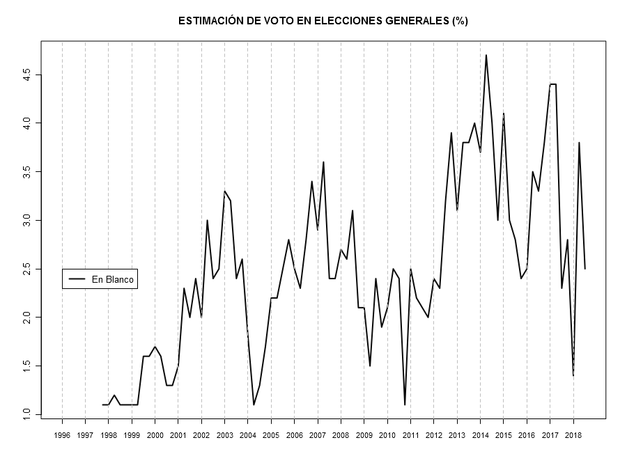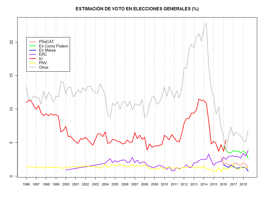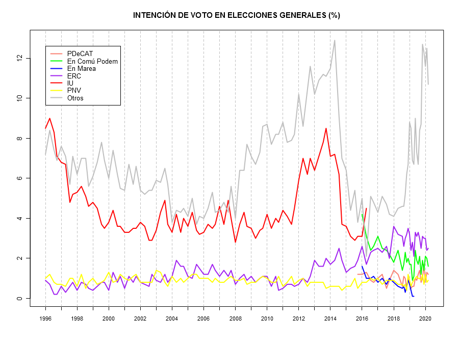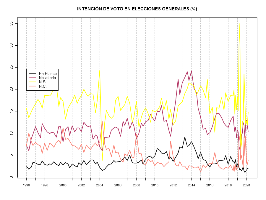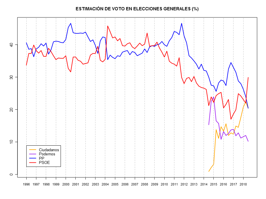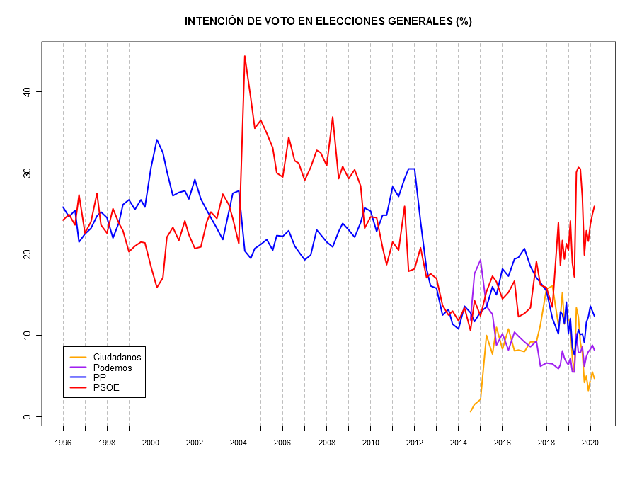 Gráfico de la serie de la intención de voto en elecciones generales - PP/PSOE/Podemos/C's