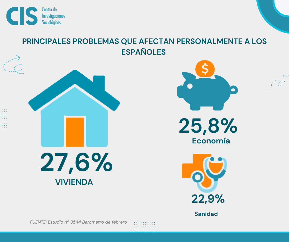 En el ámbito personal, después de la de la vivienda, se apuntan los problemas relacionados con la economía (25,8%) y la sanidad (22,9%).